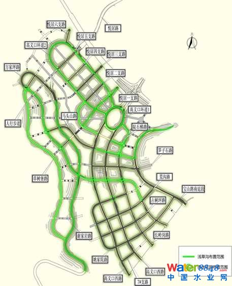 基于LID(Low Impact Design)的設(shè)計理念,將雨水作為一種資源,采用生態(tài)工程方法將道路紅線范圍內(nèi)的雨水徑流匯集進(jìn)入淺草溝或持水花園進(jìn)行綜合處置;地塊內(nèi)雨水應(yīng)通過地塊開發(fā)建設(shè)中配套實施的雨水綜合利用設(shè)施進(jìn)行綜合利用。
