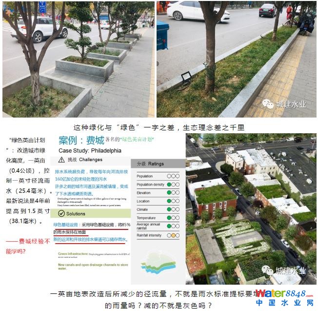 道路排水管道要為將服務(wù)范圍內(nèi)排水對(duì)象的污水、雨水有效接入創(chuàng)造條件。自2006年,上海市水務(wù)局在推進(jìn)第三輪環(huán)保三年行動(dòng)計(jì)劃時(shí),就提出了二級(jí)管網(wǎng)(沿道路敷設(shè),服務(wù)于道路兩側(cè)排水戶的排水管道)包括伸出道路紅線一米的支管和支管末端檢查井,以便于三級(jí)管網(wǎng)(街坊、小區(qū)、企事業(yè)單位內(nèi))排水管道的接入。現(xiàn)在看來,無疑是對(duì)實(shí)現(xiàn)污水全收集是正確和合理的。另外為了應(yīng)對(duì)雨水排水標(biāo)準(zhǔn)提高,有兩個(gè)做法,一是做“加法”,二是做“減法”。“加法”不單是按照新的標(biāo)準(zhǔn)加大道路雨水管管徑,更重要的是要按照新的雨水標(biāo)準(zhǔn)把雨水篦子和連管設(shè)置好,要讓雨水系統(tǒng)能夠做到(雨水口)“嘴巴喝得進(jìn)”、(連管)“嗓子進(jìn)得去”、(道路雨水管)“腸子不梗阻”、(雨水排口)“排口排得出”。一定要記住脫離雨水收集口的雨水排水設(shè)計(jì)是不完整的雨水排水設(shè)計(jì)。“減法”就是做好LID,利用“海綿措施”把徑流量減下來,“減法”實(shí)際上也是對(duì)“進(jìn)口”一種創(chuàng)新設(shè)計(jì)。將道路綠化隔離帶、人行道、小區(qū)內(nèi)部、屋頂進(jìn)行海綿化改造和設(shè)計(jì),這就是創(chuàng)建“海綿城市”的具體行動(dòng),這就是城市工程海綿化。圖中美國費(fèi)城的“綠色英畝計(jì)劃”案例就證明,“減法”是雨水排水提標(biāo)的重要手段。做好“減法”還會(huì)收到一個(gè)非常好的效果,那就是有效減少了“徑流污染”,這是實(shí)現(xiàn)城市水體“下雨不黑”的最有效措施。“減法”體現(xiàn)的是“綠、灰”相結(jié)合,體現(xiàn)的是“優(yōu)先考慮更多利用自然力量排水”。廣州利用綠色措施實(shí)現(xiàn)“排水單元達(dá)標(biāo)”就是對(duì)雨污混接改造工作的創(chuàng)造性發(fā)展。很多城市雨水排水規(guī)劃、設(shè)計(jì)文件為體現(xiàn)海綿城市創(chuàng)建和提標(biāo),不談綠色措施,而簡單地將“綜合徑流系數(shù)”調(diào)整0.6是不科學(xué)、不現(xiàn)實(shí)和不負(fù)責(zé)任的做法。