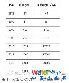 表 1 是我國(guó)城鎮(zhèn)污水處理廠工程建設(shè)的大致歷程及發(fā)展預(yù)測(cè):從最早的幾座污水處理廠到現(xiàn)在的3800多座。個(gè)人預(yù)計(jì),到2015年年底會(huì)接近5000座;到2020年應(yīng)該達(dá)到萬座以上;到2030年肯定會(huì)過2萬座。數(shù)量雖然是增加的,但總體處理規(guī)模并不是線性增加的,也就是說當(dāng)前及今后的污水處理廠平均單座規(guī)模會(huì)越 來越小。在2020年到2030年之間, 還會(huì)有一個(gè)重要的變化特征:我們會(huì)把雨水尤其是初期雨水考慮在內(nèi),這就會(huì)帶來很多大型和超大型城市的污水處理廠設(shè)計(jì)處理能力至少要擴(kuò)增50% 以上。只不過這個(gè)過程可能還需要20年到30年甚至更長(zhǎng)的時(shí)間。