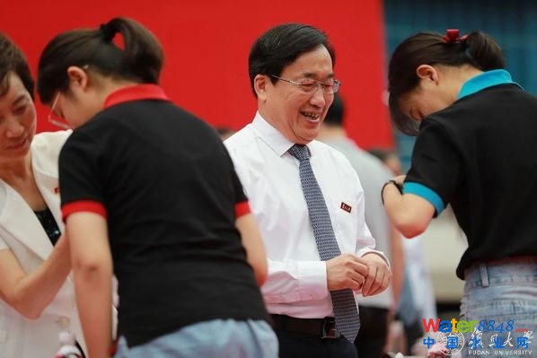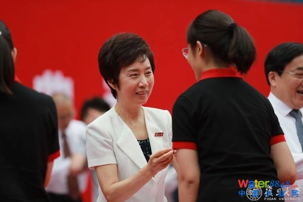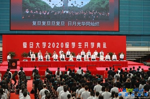在主席臺就座的校領(lǐng)導(dǎo)和老師們?yōu)樾律硎诖餍;铡_@一刻起,全體新生有了一個共同的名字:“復(fù)旦人”。