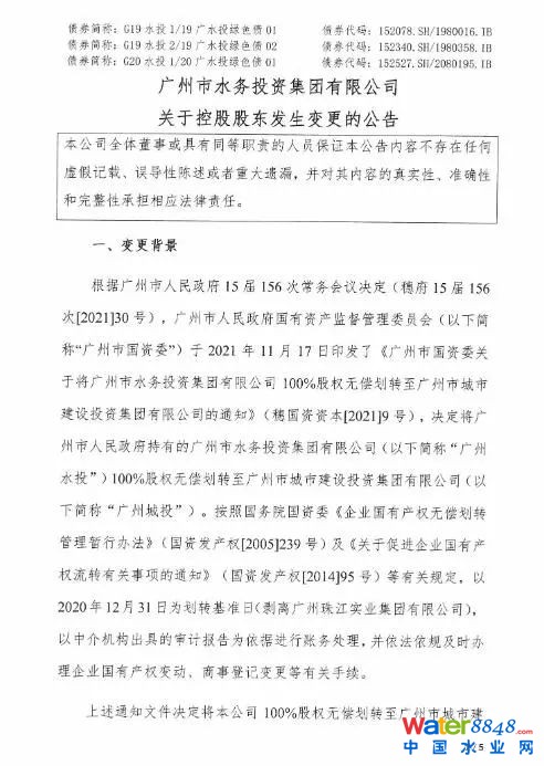 廣州市水務(wù)投資集團(tuán)有限公司公告稱,廣州市人民政府國有資產(chǎn)監(jiān)督管理委員會(huì)于2021年11月17日印發(fā)了《廣州市國資委關(guān)于將廣州市水務(wù)投資集團(tuán)有限公司100%股權(quán)無償劃轉(zhuǎn)至廣州市城市建設(shè)投資集團(tuán)有限公司的通知》,上述通知文件決定將本公司100%股權(quán)無償劃轉(zhuǎn)至廣州城投,廣州城投作為本公司100%%全資控股的控股股東,本次控股股東變更事項(xiàng)的決策程序符合法律法規(guī)和公司章程的規(guī)定。