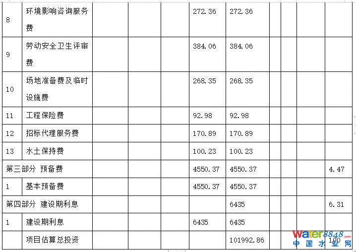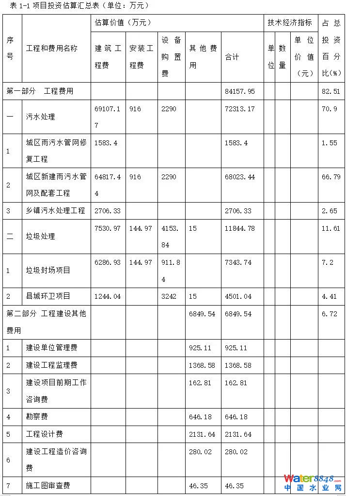 各子項目的建設投資金額為:其中,污水處理項目投資81706.16萬元,垃圾處理項目投資13851.70萬元,建設期利息6435萬元。