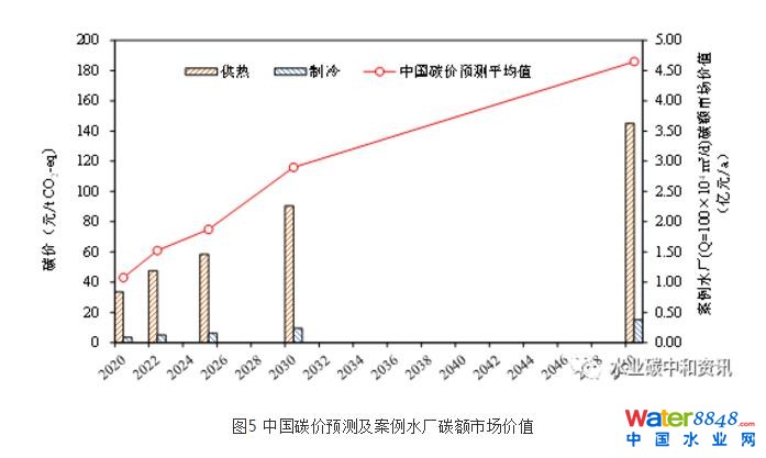 中國(guó)預(yù)計(jì)碳價(jià)在2025年為75元/tCO2,2030年將升至116元/tCO2,最終在2050年達(dá)到186元/tCO2。污水余溫?zé)崮芾锰冀灰资袌?chǎng)價(jià)值將會(huì)翻倍增加;到2050年,案例水廠(Q=100萬(wàn)m³/d)碳額市場(chǎng)理論價(jià)值將超過(guò)3.5 億元/a (圖5)。