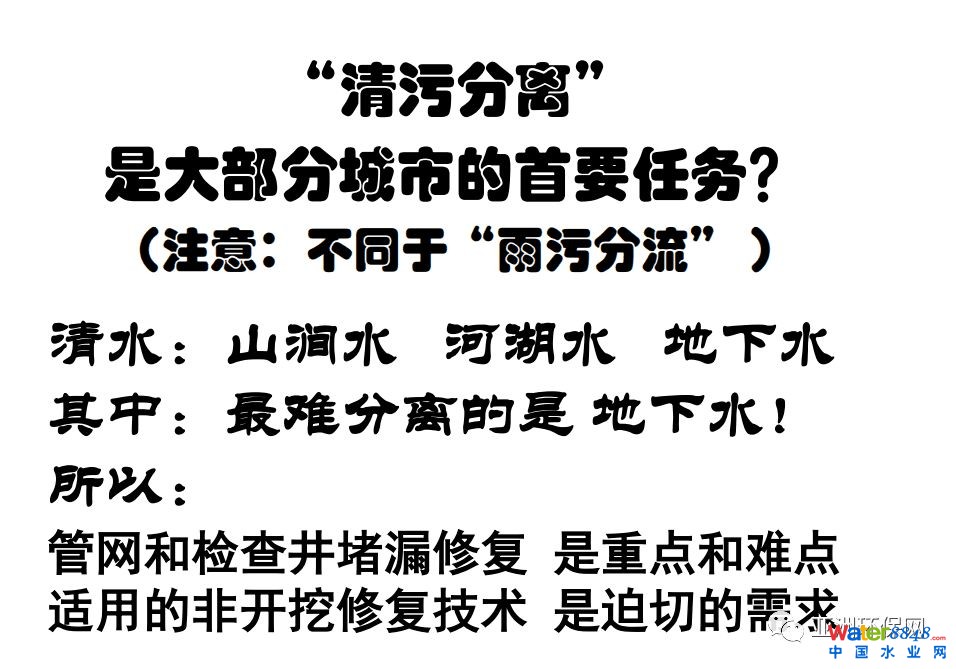 “清水包括山澗水、河湖水、地下水。檢測(cè)證明,大量是從管網(wǎng)漏進(jìn)來(lái)的。特別是地下水,量大面廣最難分離,因此,管網(wǎng)和檢查井堵漏修復(fù)是重點(diǎn)和難點(diǎn),對(duì)適用的非開(kāi)挖修復(fù)技術(shù)需求迫切。”張悅表示,對(duì)于地下水必須真刀實(shí)槍下功夫。不能做躲了這一代,難題留給下一代的事兒。