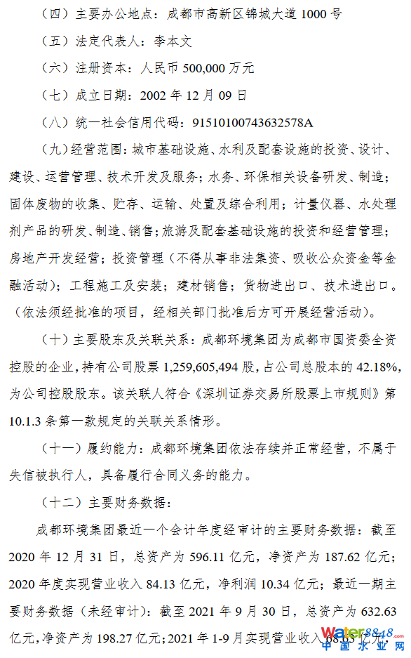 青白江成環(huán)水務(wù)系實(shí)施青白江第三污水處理廠及配套管網(wǎng)工程項(xiàng)目(以下簡稱“青白江三污項(xiàng)目”)的項(xiàng)目公司。青白江三污項(xiàng)目為中央、省、市環(huán)保督查問題整改工作的重點(diǎn)項(xiàng)目。2019 年,由于該項(xiàng)目原中標(biāo)單位因自身資金鏈問題無力繼續(xù)投資、建設(shè)和運(yùn)營該項(xiàng)目,中標(biāo)資格被取消,為按照中央環(huán)保督查工作要求加快推進(jìn)青白江三污項(xiàng)目的建設(shè)進(jìn)度,成都市青白江區(qū)人民政府與成都環(huán)境集團(tuán)磋商,將青白江三污項(xiàng)目特許經(jīng)營權(quán)授予成都環(huán)境集團(tuán)設(shè)立的項(xiàng)目公司,由項(xiàng)目公司以 BOT 方式實(shí)施該項(xiàng)目。根據(jù)特許經(jīng)營權(quán)協(xié)議,成都環(huán)境集團(tuán)在對(duì)項(xiàng)目公司控制權(quán)不變的情況下,可將項(xiàng)目公司股權(quán)轉(zhuǎn)讓給下屬子公司。為避免與公司產(chǎn)生同業(yè)競爭,經(jīng)與公司協(xié)商一致,成都環(huán)境集團(tuán)擬向公司轉(zhuǎn)讓青白江成環(huán)水務(wù) 100%股權(quán)。