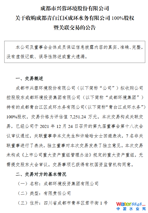 興蓉環(huán)境:擬以7251.24萬元收購青白江成環(huán)水務(wù)100%股權(quán)