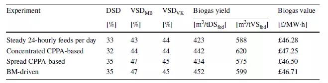 對比后發(fā)現(xiàn),三種針對電價高峰設定的污泥進料模式下,單位有機物的產甲烷率有所提升,生物沼氣產量平均要比要比污泥全天均勻進料的常規(guī)模式高4%,生物沼氣經濟價值可提升2%。