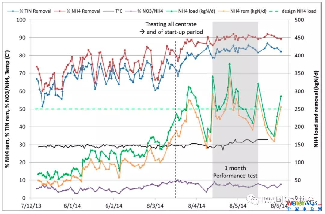 盡管這個(gè)項(xiàng)目的接種比只有5%,但啟動(dòng)時(shí)間僅需要13周。此外,在這個(gè)案例里,工程團(tuán)隊(duì)遇到了實(shí)際負(fù)荷超過設(shè)計(jì)負(fù)荷、進(jìn)水流量波動(dòng)、聚合物殘留多、高TSS沖擊等影響。該污水廠的目標(biāo)負(fù)荷是設(shè)計(jì)負(fù)荷的120-150%,出水氨氮在200-300mgN/L之間,這使得氨氮的實(shí)際去除率僅為67-75%。但這是在沒有投加額外堿度的情況下完成的。ANITA Mox的出水則通過剩下的回流污泥曝氣池做進(jìn)一步處理。