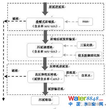 工藝流程簡介:污水處理廠重力濃縮后含水率98%的污泥通過泵輸送至污泥調(diào)理池,在污泥調(diào)理池中投加骨架結(jié)構(gòu)體和破胞藥劑,使之與污泥混合均勻,在兩種藥劑協(xié)同作用下對(duì)污泥胞外聚合物進(jìn)行破壞,改變污泥水分分布,從而達(dá)到污泥改性效果。改性后的污泥再用高壓泵輸送至板框脫水機(jī),脫水后得到含水率為60%以下的塊狀泥餅。