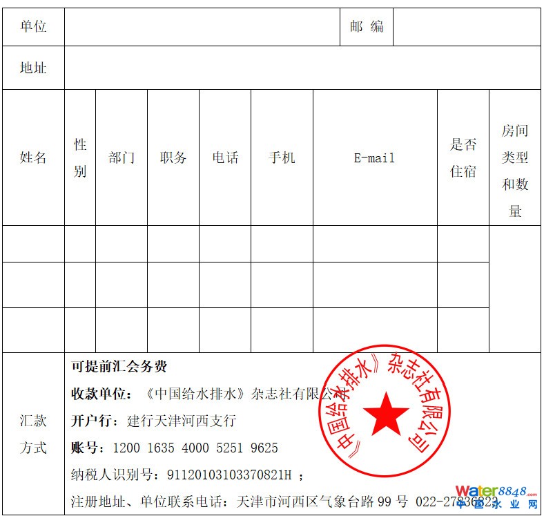(收款單位:《中國給水排水》雜志社有限公司;開戶行:建行天津河西支行;