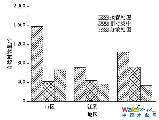 (4)其他模式:水環(huán)境容量大、生活污水處理程度能與當(dāng)?shù)刂饕?jīng)濟(jì)作物灌溉需求相結(jié)合的地區(qū)(陽山鎮(zhèn)桃林模式)就近進(jìn)行資源化利用。至2020年8月底,市區(qū)、江陰市和宜興市采用接管模式處理的自然村分別為1579、712個和1041個,占各區(qū)各自然村農(nóng)村生活處理比例分別為59.12%、46.65%和49.45%,具體治理模式情況如圖2所示。隨著無錫市對農(nóng)村生活污水治理力度不斷加大,對入戶管網(wǎng)進(jìn)行排查和完善,農(nóng)村生活污水收集情況總體較好,接管處理和相對集中處理模式能夠較好地接收和處理污水,極少數(shù)小型分散處理設(shè)施收集率較低,存在“曬太陽”現(xiàn)象。