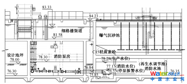 根據(jù)《消防給水及消火栓系統(tǒng)技術(shù)規(guī)范》,本項(xiàng)目同一時(shí)間內(nèi)的火災(zāi)起數(shù)按1起考慮。消防給水1起火災(zāi)滅火用水量應(yīng)按需要同時(shí)作用的室內(nèi)外消防給水用水量之和計(jì)算,兩座及以上建筑合用時(shí),應(yīng)取最大者。鄭州新區(qū)污水廠二期工程消防用水量最大的建筑為干化車間,經(jīng)計(jì)算消防總水量為1 026 m³。消防水源采用污水廠處理后的再生水。本項(xiàng)目消防水池有效容積為1 050 m³,根據(jù)《消防給水及消火栓系統(tǒng)技術(shù)規(guī)范》要求,應(yīng)設(shè)置能獨(dú)立使用的兩座消防水池,見圖2。因工藝水力高程需要,細(xì)格柵及曝氣沉砂池豎向標(biāo)高位于設(shè)計(jì)地坪以上,可利用細(xì)格柵及曝氣沉砂池下部空間設(shè)置消防泵房、再生水泵房、再生水調(diào)節(jié)池和消防水池,見圖3~圖5。