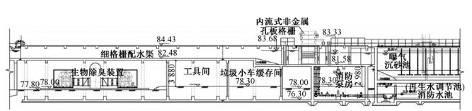 本項(xiàng)目將格柵和沉砂池進(jìn)行合建,該單體集合了粗格柵及提升泵房、細(xì)格柵及曝氣沉砂池、消防泵房、消防水池、再生水泵房、再生水調(diào)節(jié)池、生物除臭裝置、工具間、垃圾小車緩存間,共9種功能單元,見圖1~圖3。設(shè)計(jì)階段對(duì)設(shè)備安裝、巡檢、物料運(yùn)輸路由等影響因素進(jìn)行了重點(diǎn)規(guī)劃。