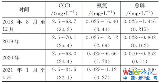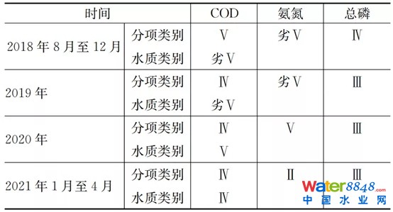 練江流域新一輪的整治工作重點中,加強污水處理產(chǎn)及配套管網(wǎng)的建設以擴大污水收集能力及處理能力,配合河道清理、清淤及垃圾處置,流域水質不斷改善。海門灣橋閘斷面2018年至2021年的水質監(jiān)測數(shù)據(jù)見表1和表2。