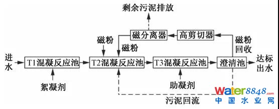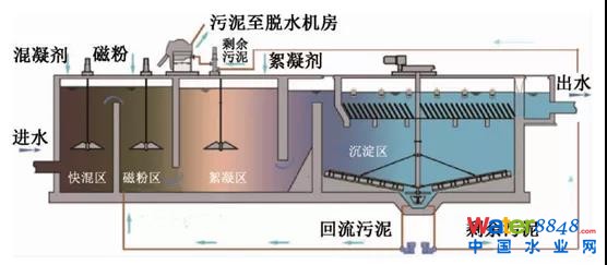 在普通高密度沉淀池的基礎(chǔ)上,同步加入磁介質(zhì)(磁粉相對(duì)密度為5.2,粒徑較小),通過絮凝、吸附、架橋的作用將水中的微小懸浮物或不溶性污染物與粒徑極小的磁性顆粒進(jìn)行極有效率的結(jié)合,來增加絮體的體積和密度。從而加快絮體的沉降速度,有效降低了澄清池的水力停留時(shí)間并增大了其表面負(fù)荷。
