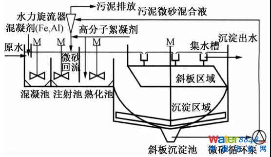 4.3 加砂高速沉淀池(微砂循環(huán))在普通高密度沉淀池的基礎(chǔ)上,將泥渣循環(huán)改為微砂循環(huán),形成了一種新型工藝—加砂高速沉淀池,以威立雅公司開發(fā)的Actiflor工藝為典型代表。該工藝通過投加微砂(粒徑為100~150μm),使污染物在高分子絮凝劑的作用下與微砂聚合成大顆粒的易于沉淀的絮體,從而加快了污染物在沉淀池中的沉淀速度,又結(jié)合斜板沉淀的原理,大大減少了沉淀池的面積及沉淀時(shí)間,并能得到良好的出水效果。