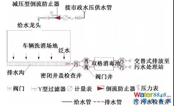 設(shè)計(jì)建議:洗消場(chǎng)地設(shè)置給水龍頭、排水溝、埋地式消毒池,如圖8所示。從市政水壓給水管接出給水支管,設(shè)置減壓型倒流防止器或壓力型真空破壞器。排水溝接入埋地式消毒池預(yù)處理后廢水排入院區(qū)污水處理站。