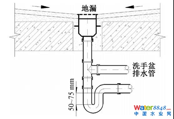 設(shè)計(jì)建議:利用地漏附近的洗手盆排水對(duì)地漏水封補(bǔ)水,補(bǔ)水點(diǎn)設(shè)在存水彎前的短管上,水封有效高度不小于50 mm、不大于100 mm,如圖4所示。