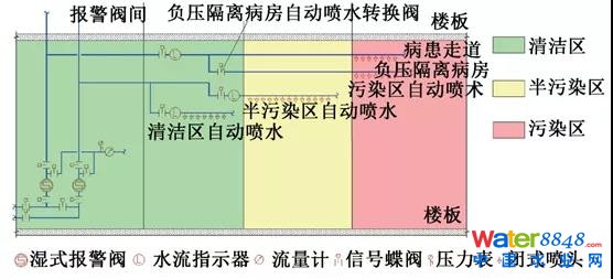 設(shè)計(jì)建議:消防給水管井位置、管道敷設(shè)走向按“疫時(shí)”土建平面設(shè)置,遵循按水流方向經(jīng)清潔區(qū)-半污染區(qū)-污染區(qū)的原則。對(duì)于自動(dòng)噴水滅火系統(tǒng),當(dāng)系統(tǒng)規(guī)模較大時(shí),可按“三區(qū)”各自獨(dú)立設(shè)置報(bào)警閥。圖7是上海某獨(dú)立病房樓“平疫結(jié)合”設(shè)計(jì)中自動(dòng)噴水滅火系統(tǒng)的簡(jiǎn)化系統(tǒng)原理介紹。該系統(tǒng)設(shè)計(jì)遵循水流方向經(jīng)清潔區(qū)-半污染區(qū)-污染區(qū)的原則,在不增加報(bào)警閥數(shù)量的前提下將污染區(qū)、清潔區(qū)和半污染區(qū)從報(bào)警閥開(kāi)始各自獨(dú)立成兩個(gè)系統(tǒng)。