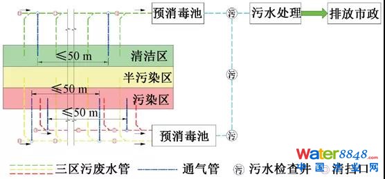 設(shè)計(jì)建議:根據(jù)土建專業(yè)“疫時(shí)”平面劃分的清潔區(qū)、半污染區(qū)、污染區(qū),三區(qū)各自設(shè)置獨(dú)立的排水系統(tǒng)及其通氣系統(tǒng),相互不串接。