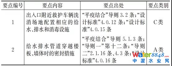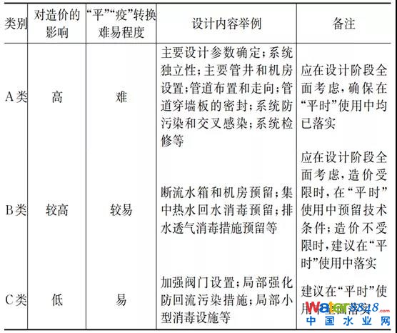 不論是哪種情況的“平疫結(jié)合”,其給排水設(shè)計(jì)內(nèi)容按照投資成本、技術(shù)措施難易程度,具體實(shí)施差異程度等內(nèi)容,大致可以分為3類,暫定為A類、B類和C類(此類別為暫定,且僅供本文使用)。A類主要是指滿足“疫時(shí)”使用需求的土建和機(jī)電基礎(chǔ)條件,這類基礎(chǔ)條件本身不影響“平時(shí)”使用,卻是在設(shè)計(jì)之初至建設(shè)竣工必須定型的,一旦進(jìn)行“平”轉(zhuǎn)“疫”時(shí)再改動(dòng)會(huì)投入大量的人力、物力、財(cái)力,會(huì)影響醫(yī)療流程的布置、改變現(xiàn)有的機(jī)電系統(tǒng)甚至?xí)植科茐慕ㄖ慕Y(jié)構(gòu)體系,以至于對(duì)“平”轉(zhuǎn)“疫”產(chǎn)生較大影響甚至是決定性因素的設(shè)計(jì)內(nèi)容。B類主要指“平時(shí)”無(wú)特定需求,可通過(guò)預(yù)留技術(shù)條件來(lái)滿足“疫時(shí)”需求的設(shè)計(jì)內(nèi)容,此類預(yù)留技術(shù)條件往往具一定的造價(jià)和投資規(guī)模,“平時(shí)”使用造成不必要的浪費(fèi),但具備短時(shí)間內(nèi)快速成型投入使用、施工安裝和調(diào)試簡(jiǎn)單、材料規(guī)格通用性強(qiáng)等特點(diǎn)。C類主要是在“平時(shí)”技術(shù)條件上稍作局部加強(qiáng)或優(yōu)化即可滿足“疫時(shí)”需求,可有效提升系統(tǒng)安全性、可靠性,但本身易實(shí)施、造價(jià)低。表1從對(duì)造價(jià)的影響、“平”“疫”轉(zhuǎn)換難易程度、設(shè)計(jì)內(nèi)容舉例等方面對(duì)此3類設(shè)計(jì)內(nèi)容進(jìn)行了歸納總結(jié)。