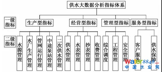 2020年 1月,中國城鎮(zhèn)供水排水協會發(fā)布的《中國城鎮(zhèn)水務 2035年行業(yè)發(fā)展規(guī)劃》中指出“要明確智慧水務的概念、內涵及指標體系”,本文以供水行業(yè)為例,結合國內供水行業(yè)的特點和大數據應用場景因素,將供水行業(yè)大數據分析指標分為生產、經營、管理和服務型四類,以構建供水大數據分析的標準體系(見圖3)。