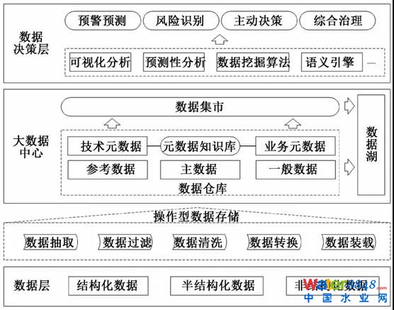 因此,智慧水務大數據構建可分為數據整合、數據治理和數據應用三大步驟,對應的技術架構自下而上分為三個部分(見圖2),分別是數據層、大數據中心和數據決策層。