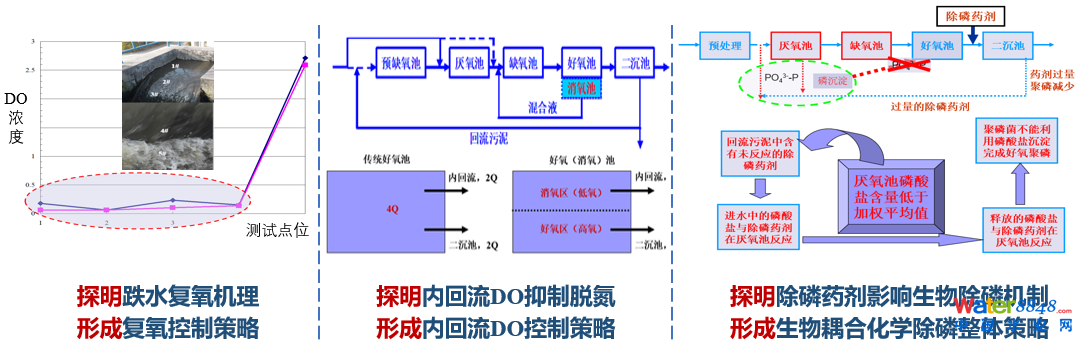 構(gòu)建以歷史出水水質(zhì)分析識別超標因子-以物質(zhì)成分解析識別超標組分-以測試測算方法計算超標額度的“三步法”出水達標影響因子識別及難點解析策略;創(chuàng)立基于功能區(qū)特征指標沿程布測→基于活性污泥功能速率的功能區(qū)效能分析→基于實測耦合模擬的功能區(qū)潛力挖掘相結(jié)合的“三步遞進法”系統(tǒng)評估方法模型;以指標簡易、測試簡便、數(shù)據(jù)簡單為目標,提出便于現(xiàn)場靈活測試的不同功能區(qū)特征指標、計算模型及管控要點;創(chuàng)立以碳源損耗和除磷抑制為核心的靶向測試分析方法,揭示跌水復(fù)氧及內(nèi)回流高DO等嚴重消耗優(yōu)質(zhì)碳源、協(xié)同化學(xué)除磷抑制生物除磷等行業(yè)共性問題。