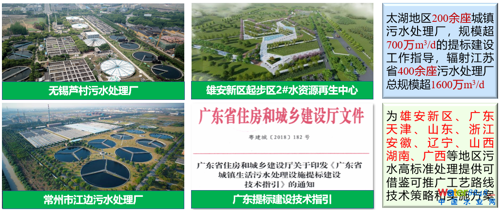 “指引”發(fā)布實施以來,得到了江蘇省太湖地區(qū)城鎮(zhèn)污水處理廠提標建設(shè)設(shè)計、建設(shè)、運營和管理單位的普遍認可和廣泛采納,有力的推動了江蘇省220余座城鎮(zhèn)污水處理廠(總規(guī)模超700萬m3/d)的提標建設(shè)工作,輻射江蘇省400余座污水處理廠總規(guī)模超1600萬m3/d,也為我國雄安新區(qū)、廣東、天津、山東、浙江等地區(qū)污水高標準處理提供可借鑒可推廣的整體技術(shù)策略和系統(tǒng)實施方案。