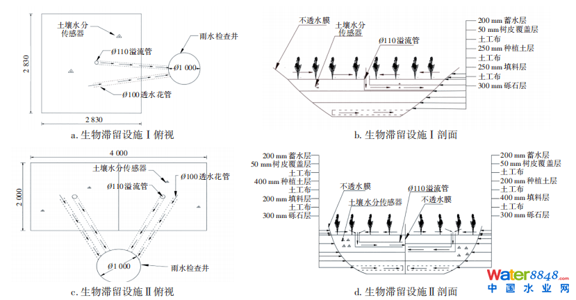 生物滯留設施實驗區(qū)共設有3處生物滯留設施,能實現(xiàn)不同類型生物滯留設施的水文調控效果比較。其中2處生物滯留設施的結構分別為填料層材料采用再生骨料以及種植土層與填料層位置互換;布設在蒸滲儀上的生物滯留設施,在對生物滯留設施的多層土壤濕度、深層滲漏、蒸散發(fā)進行監(jiān)測分析的基礎上實現(xiàn)了對生物滯留設施整個水循環(huán)的監(jiān)測分析。