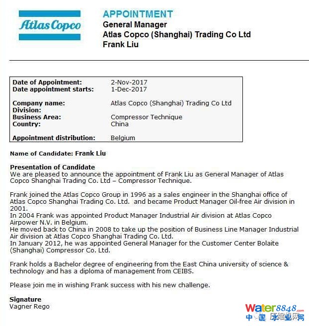 據(jù)悉,由于阿特拉斯·科普柯(上海)貿(mào)易有限公司在壓縮機(jī)領(lǐng)域是集團(tuán)內(nèi)僅次于美國(guó)的第二大客戶中心,此職務(wù)對(duì)集團(tuán)來說至關(guān)重要。自阿特拉斯·科普柯于上世紀(jì)八十年代再次進(jìn)入中國(guó)市場(chǎng)以來,始終由資深外籍高管擔(dān)任,這次是有史以來首次由中國(guó)人出任,這充分體現(xiàn)了阿特拉斯·科普柯對(duì)中國(guó)市場(chǎng)的重視,以及對(duì)劉宇鏑(Frank Liu)能力的信任和認(rèn)可!