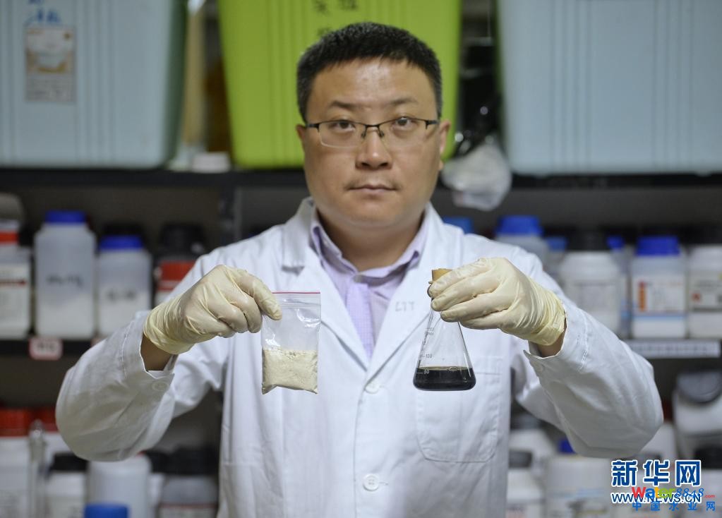 6月2日,在中國科學院成都生物研究所內,李東在展示高氨氮廢水(右)和利用這種廢水生產得到的高蛋白飼料。