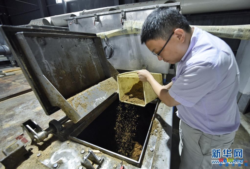 6月3日,在成都彭州市廚余垃圾處置站,李東在往廚余垃圾處理設備中投加研發(fā)的促腐—保氮—抑臭菌劑。