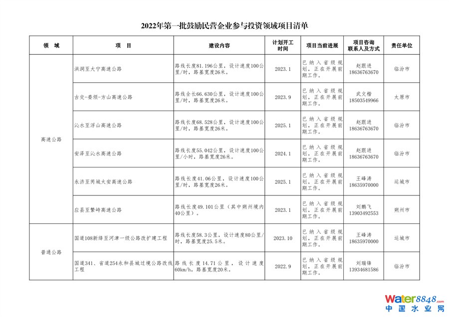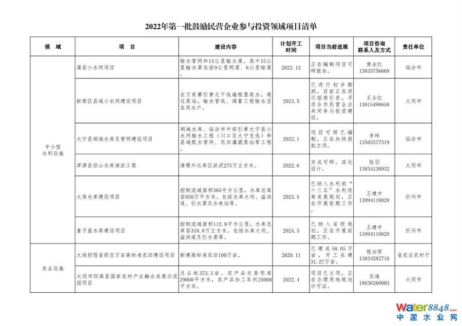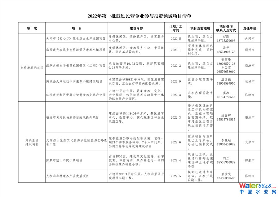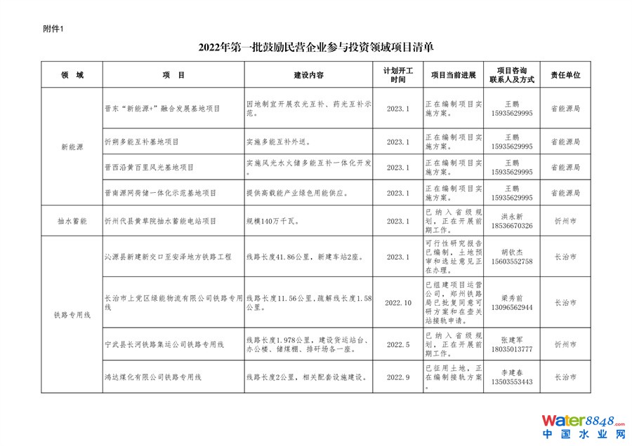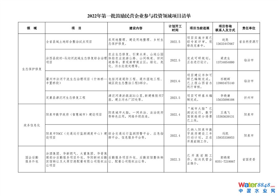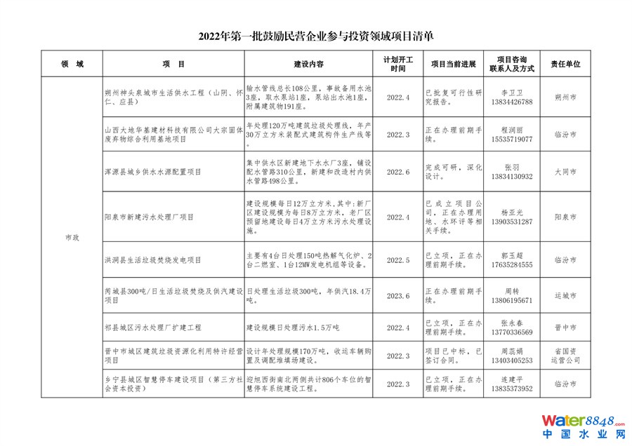 日前,山西發(fā)布發(fā)布2022年第一批鼓勵(lì)民營(yíng)企業(yè)參與投資領(lǐng)域項(xiàng)目清單。共50個(gè)項(xiàng)目,涉及污水處理廠等生態(tài)環(huán)保項(xiàng)目。詳情如下: