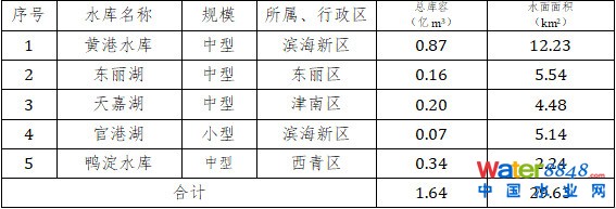 (3)主要湖庫5座,總庫容1.64億m3,分別為黃港水庫0.87億m3、東麗湖0.16億m3、天嘉湖0.20億m3,官港湖0.07億m3和鴨淀水庫0.34億m3。