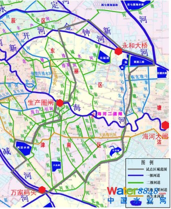 試點區(qū)域位于海河流域中下游,中心城區(qū)和濱海新區(qū)之間,永定新河匯水區(qū)與獨流減河匯水區(qū)圍合的范圍,總面積約800平方公里。區(qū)域內(nèi)現(xiàn)有16個街鎮(zhèn),46個村。包括一級河道4條,總長57.9km,分別為永定新河、獨流減河、新開—金鐘河和海河。二級河道22條,總長268.4km,其中海河以北7條,海河以南15條。主要湖庫5座,總庫容1.39億m3。