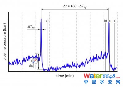 圖2:污泥管道注入點(diǎn)的壓力曲線示意圖。當(dāng)達(dá)到預(yù)定的壓力水平時,注入壓縮空氣幾秒鐘,ΔTinj,之后污泥管道中的壓力下降Δp。然后使用螺桿泵幾分鐘,Δt,將新的污泥栓塞泵入管道,直到進(jìn)行另一次壓縮空氣注入。標(biāo)記的時間a)...d)對應(yīng)于圖1所示的條件。