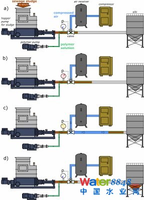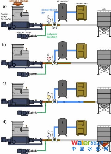 圖1:采用聚合物注入和密相氣力輸送的污水污泥輸送系統(tǒng)流程示意圖。a)壓縮污泥柱塞,直到b)在管道中達(dá)到最佳壓縮水平。c)打開壓縮空氣閥,使用壓縮空氣將污泥柱塞推進(jìn)料倉。d)輸送管道中壓力下降。