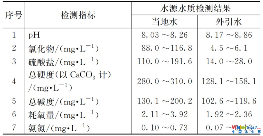某市主供水源為當地水和外引水,兩種水源在水質指標上存在許多差異,尤其是水體總硬度差別較大。當地水原水硬度常年處于280~310mg/L之間,而外引水原水硬度在128.1~158.1mg/L之間。并且,兩種水源的硫酸鹽、氯化物等指標也存在較大差異,如表2所示。