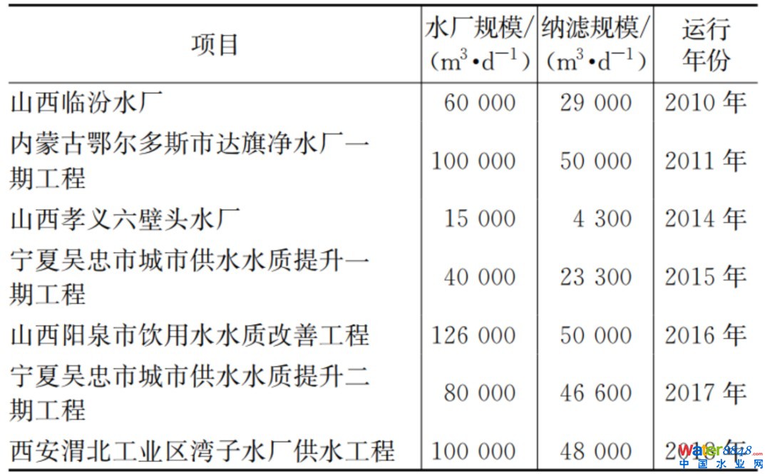 (1)苦咸地下水處理?嘞趟貐^(qū)的地下水中總硬度、硫酸鹽、氟、重金屬等含量一般偏高,以此作為原水的供水廠出廠水水質較難達到《生活飲用水衛(wèi)生標準》(GB 5749-2006)。部分地區(qū)雖然沒有超出生活飲用水衛(wèi)生標準的規(guī)定要求,但飲用水中的硬度(以碳酸鈣計)接近國標限值(450mg/L),當地居民反映在燒開后水杯內有白色沉淀,感觀較差,洗臉毛巾使用后易變黃、變硬、管網系統(tǒng)結垢嚴重,一定程度上影響人民生活質量和身體健康。隨著人民生活水平的不斷提高,安全供水的剛性需求會促使大量的苦咸水地區(qū)市政水廠實施水質提標改造。鑒于納濾技術優(yōu)良的脫鹽效果,該技術己逐漸成為苦咸水脫鹽軟化的首選,并得到了大規(guī)模的工程應用,現(xiàn)有工程案例見表1。