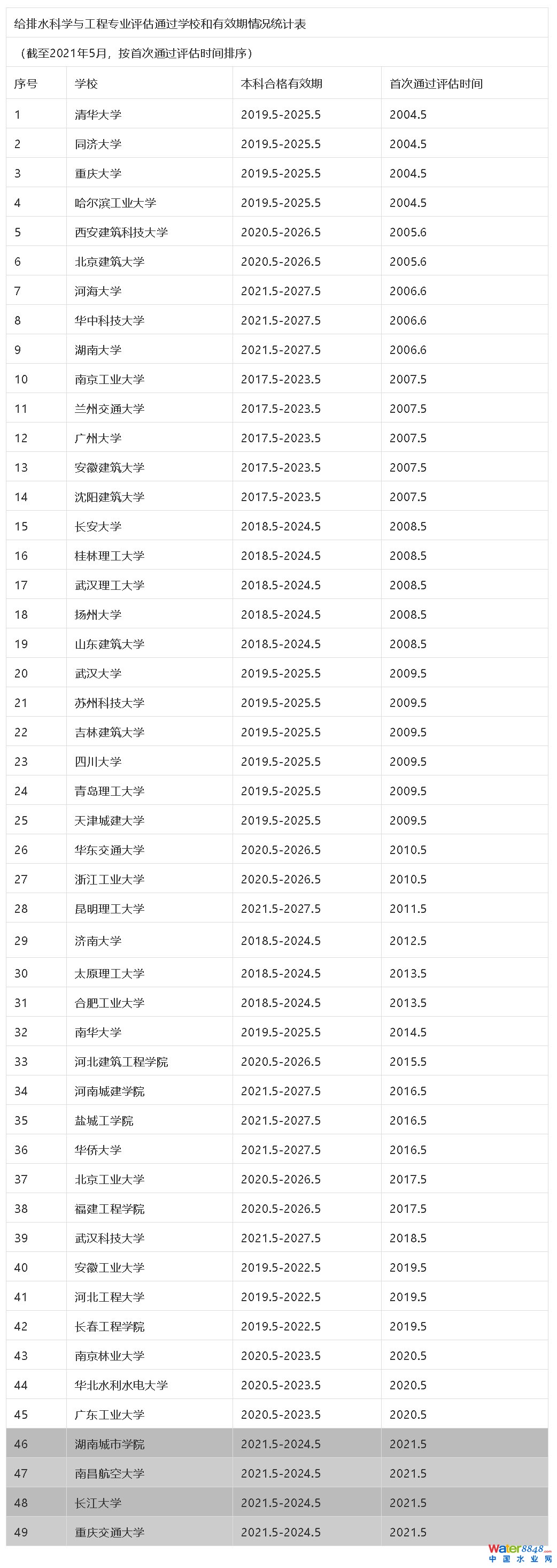 4、給排水科學與工程專業(yè)評估通過學校和有效期情況統(tǒng)計表(截至2021年5月,按首次通過評估時間排序)