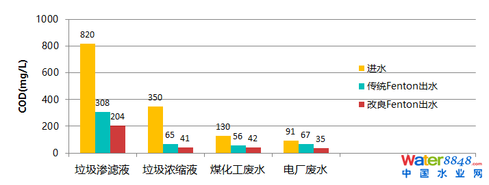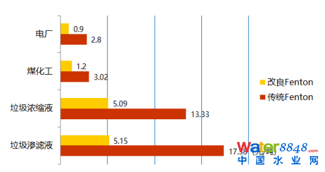 從污染物的去除效果及成本核算兩方面對傳統(tǒng)芬頓與改良芬頓工藝進行對比。無論是成分復雜的垃圾滲濾液還是含有氟化物、硫氰化物等有毒物質的煤化工廢水等,相比傳統(tǒng)芬頓,改良芬頓技術能將COD降至更低濃度,成本也大幅度降低。