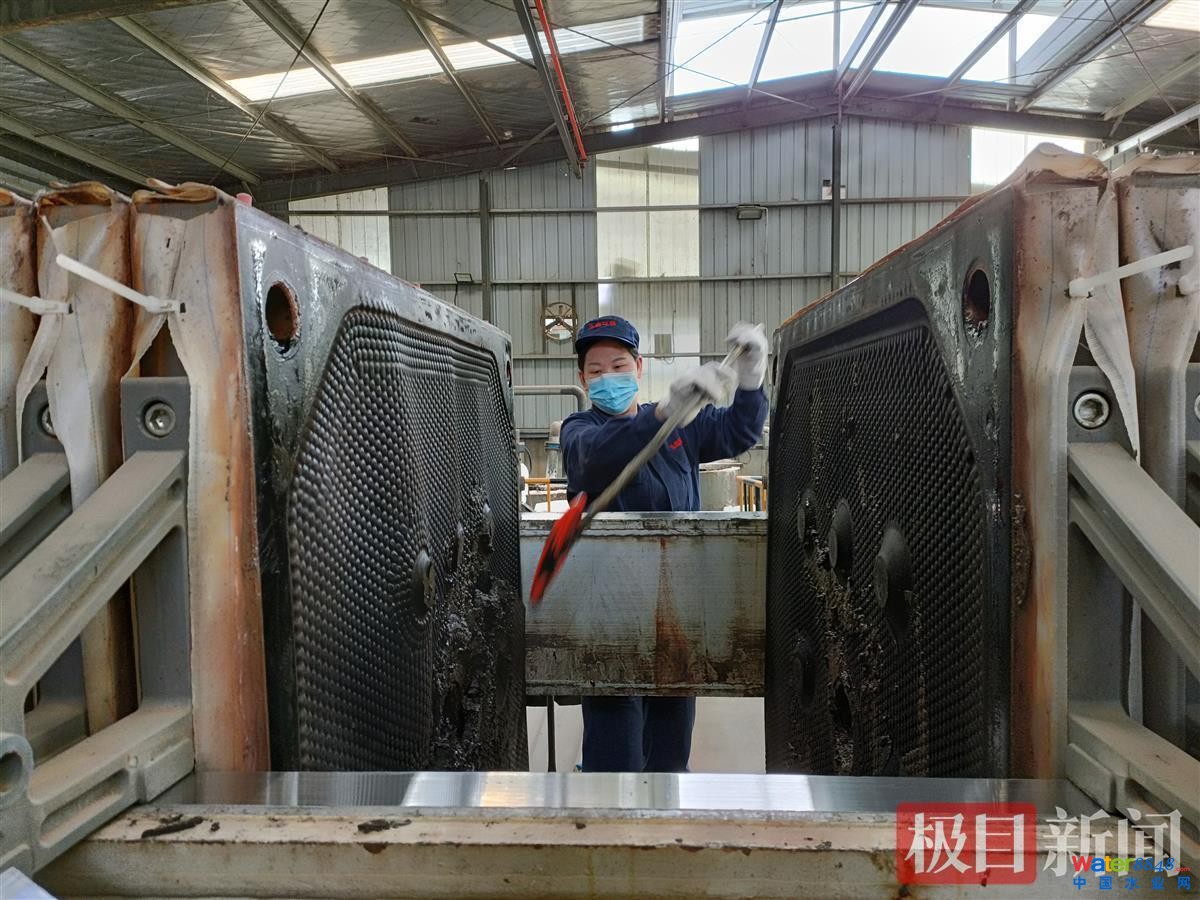 3月28日下午,在位于湖北十堰市茅箭區(qū)的湖北玉鑫新型墻材有限公司脫水車(chē)間,兩名工人手持刮鏟正對(duì)附著在壓濾機(jī)上的污泥進(jìn)行卸料處理。該公司總經(jīng)理王燁煜介紹說(shuō):“污水處理廠(chǎng)送來(lái)的污泥,含水量高達(dá)80%,我們經(jīng)壓濾機(jī)脫水處理,使污泥含水量降至60%,附著力仍很強(qiáng)!”