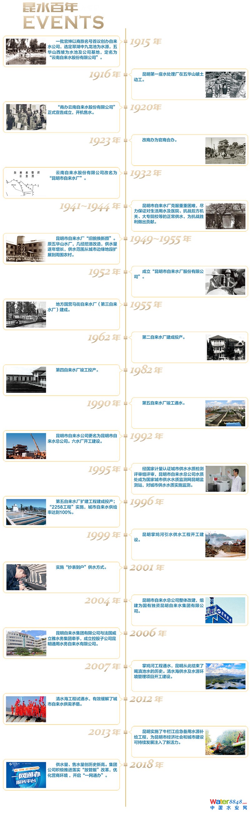 水,滋養(yǎng)城市的生命,蘊(yùn)含城市的歷史,孕育城市的靈氣,見證城市的變遷。從1915年至今,昆明城市供水事業(yè)已經(jīng)走過了一百多年的光輝歲月。百年的滄桑巨變,百年的興衰榮耀,百年的歷史積淀,昆明供水事業(yè)從艱難起步到曲折發(fā)展,從積極創(chuàng)新到跨越發(fā)展,尤其是近20年來從蒸蒸日上到蓬勃發(fā)展,昆明城市供水企業(yè)在昆明社會經(jīng)濟(jì)和城市發(fā)展的歷程中,發(fā)揮了舉足輕重的作用,成為了春城發(fā)展史這幅美麗畫卷中濃墨重彩的一筆。
