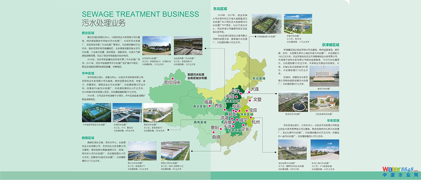 承擔(dān)城市水務(wù)業(yè)務(wù)的“創(chuàng)業(yè)環(huán)保股份有限公司”,是城投集團(tuán)旗下的滬港兩地上市公司,是我國(guó)污水處理行業(yè)的領(lǐng)跑者和行業(yè)標(biāo)準(zhǔn)的制定者。該公司不僅承擔(dān)了天津市污水處理總量的68%,業(yè)務(wù)觸角也遍及國(guó)內(nèi)數(shù)十個(gè)省市,形成了水務(wù)業(yè)務(wù)全國(guó)布局的態(tài)勢(shì)。