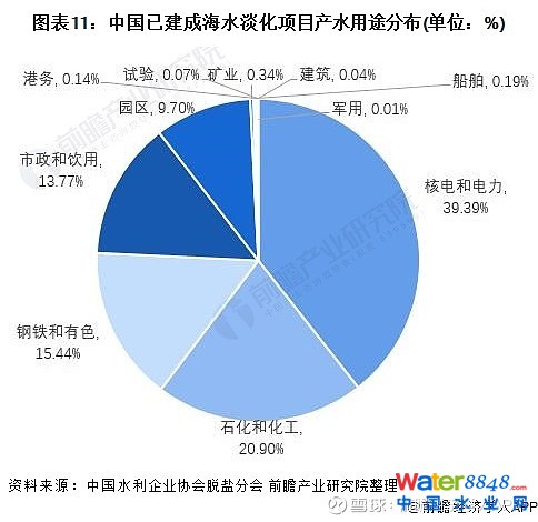 根據(jù)中國(guó)水利企業(yè)協(xié)會(huì)脫鹽分會(huì)數(shù)據(jù),截至2020年年底,我國(guó)已建成海水淡化項(xiàng)目產(chǎn)水用途分布如下,引用范圍最廣的領(lǐng)域?yàn)楹穗姾碗娏εc石化和化工,占比分別達(dá)到39.39%和20.90%。整體來(lái)看工業(yè)用水比例遠(yuǎn)高于市政用水。