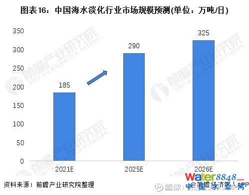 2020年我國(guó)海水淡化總規(guī)模約為165萬(wàn)噸/日。根據(jù)《海水淡化利用發(fā)展行動(dòng)計(jì)劃(2021—2025年)》,到2025年,全國(guó)海水淡化總規(guī)模達(dá)到290萬(wàn)噸/日以上,新增海水淡化規(guī)模125萬(wàn)噸/日以上,其中沿海城市新增105萬(wàn)噸/日以上,海島地區(qū)新增20萬(wàn)噸/日以上。前瞻預(yù)測(cè)2021年我國(guó)海水淡化總規(guī)模約為185萬(wàn)噸/日,2026年將超過(guò)300萬(wàn)噸/日,達(dá)到325萬(wàn)噸/日左右,年復(fù)合增長(zhǎng)率約為12%。