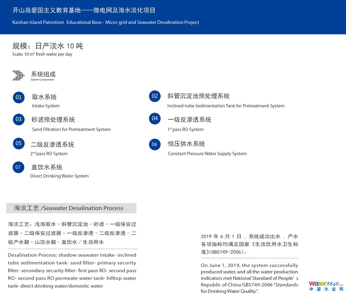 為滿足連云港開(kāi)山島的用電用水需求,2019年初,豐海公司前后經(jīng)過(guò)多次現(xiàn)場(chǎng)考察、會(huì)議研討,為該島設(shè)計(jì)和生產(chǎn)了一套日產(chǎn)10噸的海水淡化設(shè)備。該項(xiàng)目利用太陽(yáng)能、風(fēng)能,并整合島上現(xiàn)有供水、供電方式,解決島上生活用水及用電緊缺問(wèn)題。5月8日,項(xiàng)目正式開(kāi)工建設(shè),6月1日成功出水。開(kāi)山島項(xiàng)目以清潔、綠色的方式滿足電力需求,海水淡化系統(tǒng)將徹底解決守島人“看天吃水、船拉人扛”的用水難題。