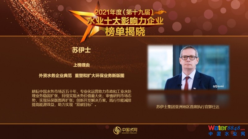 “中國水業(yè)十大影響力企業(yè)”獎項自2003年開展評選以來至今已獲得中國水務(wù)企業(yè)的廣泛認(rèn)同,成為行業(yè)內(nèi)具有公信力和影響力的權(quán)威評選活動。2021年度的評選吸引了約400家水務(wù)企業(yè)參與,蘇伊士憑借其在中國近五十年來持續(xù)開發(fā)的創(chuàng)新解決方案,為市政和工業(yè)客戶提供專業(yè)化的水務(wù)運營和管理,推動中國水務(wù)行業(yè)發(fā)揮其價值并助力中國實現(xiàn)“雙碳目標(biāo)”的表現(xiàn)脫穎而出,獲譽“外資水務(wù)企業(yè)典范”。
