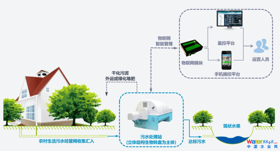 該項(xiàng)目針對每個(gè)村的實(shí)際情況,因地制宜,分類施策,探索出污水治理模式——推廣“分離、分流、納管、凈化”(黑水與灰水分離、雨水與污水分流、污水納管、生物轉(zhuǎn)盤工藝凈化)模式,高效治理“三水”(廁所糞污、廚房污水、洗滌污水)。由政府投資建設(shè)三格式化糞池、污水收集管網(wǎng)、3D-RBC立體結(jié)構(gòu)生物轉(zhuǎn)盤工藝污水站等設(shè)施;配備吸污車輛,設(shè)立長效運(yùn)維專項(xiàng)資金,采用專業(yè)化污水處理團(tuán)隊(duì)與國企聯(lián)合運(yùn)維,實(shí)行鎮(zhèn)督導(dǎo)、村落實(shí)、運(yùn)維班組實(shí)施的管理運(yùn)維模式。